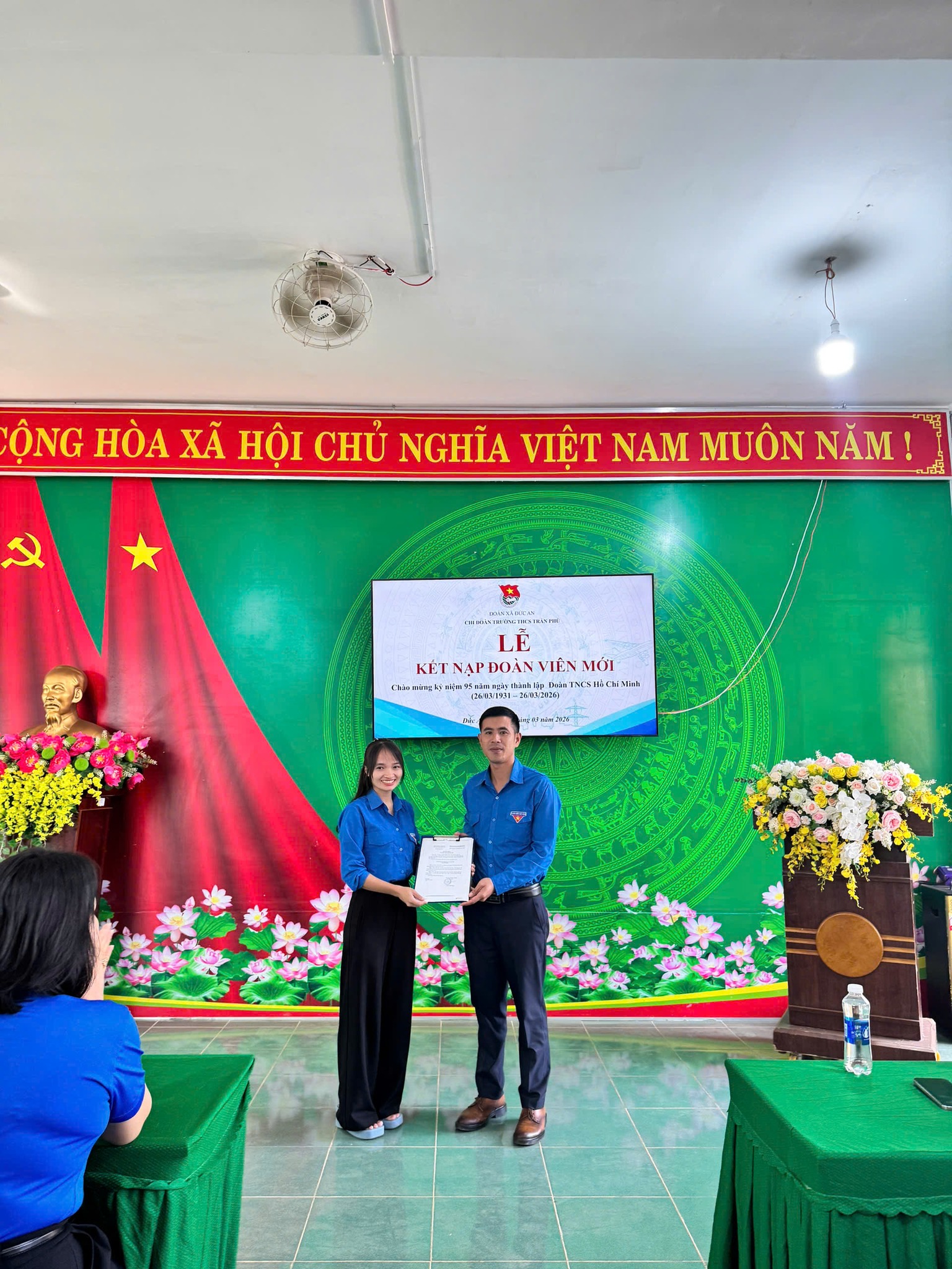 Trong không khí rộn ràng của những ngày tháng 3 lịch sử, chào mừng kỷ niệm 95 năm ngày thành lập Đoàn TNCS Hồ Chí Minh (26/3/1931 – 26/3/2026), Được sự nhất trí của Chi bộ, Chi đoàn Trường THCS Trần Phú long trọng tổ chức lễ kết nạp đoàn viên mới cho các đội viên ưu tú. Đây không chỉ là sự ghi nhận nỗ lực cá nhân, mà còn là bước ngoặt trưởng thành, đánh dấu sự đứng vào hàng ngũ tiên phong của tuổi trẻ Việt Nam.