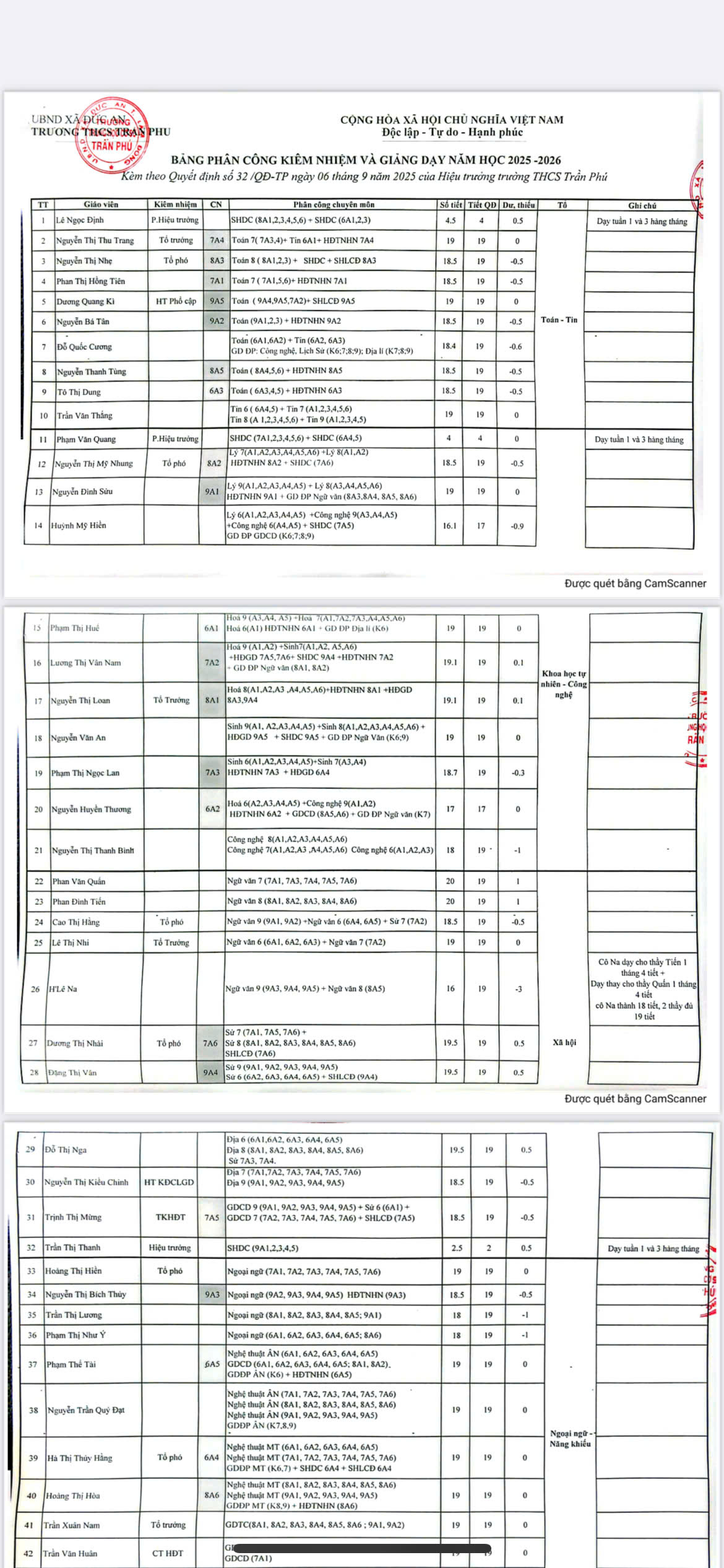 PCCM, THỜI KHÓA BIỂU SỐ 1 NĂM HỌC 2025-2026