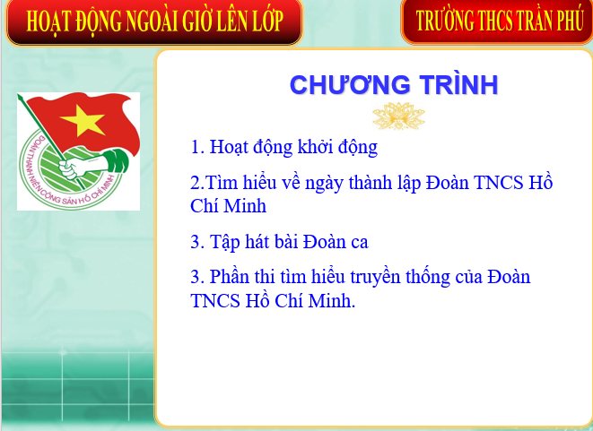 Được sự đồng ý của Chi Bộ nhà trường và thực hiện Kế hoạch số 01/KH-ĐTN, Chi Đoàn trường THCS Trần Phú phối hợp với GVCN khối 9 và Đội TNTP tổ chức hoạt động Bồi dưỡng nhận thức về Đoàn cho học sinh khối 9 (thuộc đối tượng chuẩn bị tham gia Đoàn) với chủ đề: “TIẾN BƯỚC LÊN ĐOÀN”